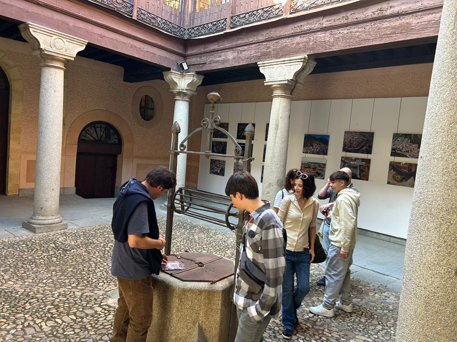 Am revenit acum, după douăzeci și trei de ani, cu o expoziție despre piețele europene, la invitația ICR Madrid – Plazas Europeas de Cine. E o buclă a timpului care s-a suprapus firesc. Prima mea fotografie conștientă într-o piață și prima expoziție la Segovia, orașul care m-a învățat să privesc. Expoziția este găzduită în Patio del Colegio de Arquitectos, pe drumul care leagă Catedrala de Alcázar. Un patio de piatră și lumină, cu fântână centrală și coloane de granit. Locul pare creat special pentru a vorbi despre privirea de sus, despre arhitectură și despre timp.